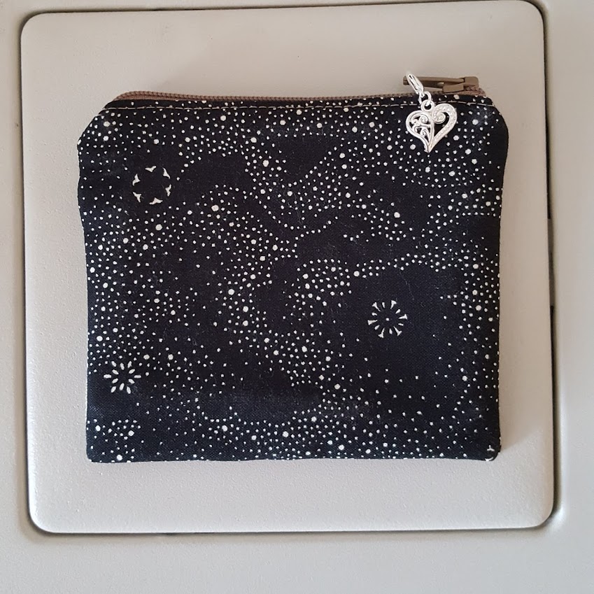 I made another cute coin purse gift. This is a modified version of the Black Hearted Queen freebie from SubRosa Designs. The chart is still available on her blog here. The red dress idea was someone else's color change that I adopted. The wording change was my brain child. Less border too. Love my little heart charm zipper pull. This is on 32 ct summer khaki linen over 2. Zipper pull charm from Creative Kinyobi on Etsy.